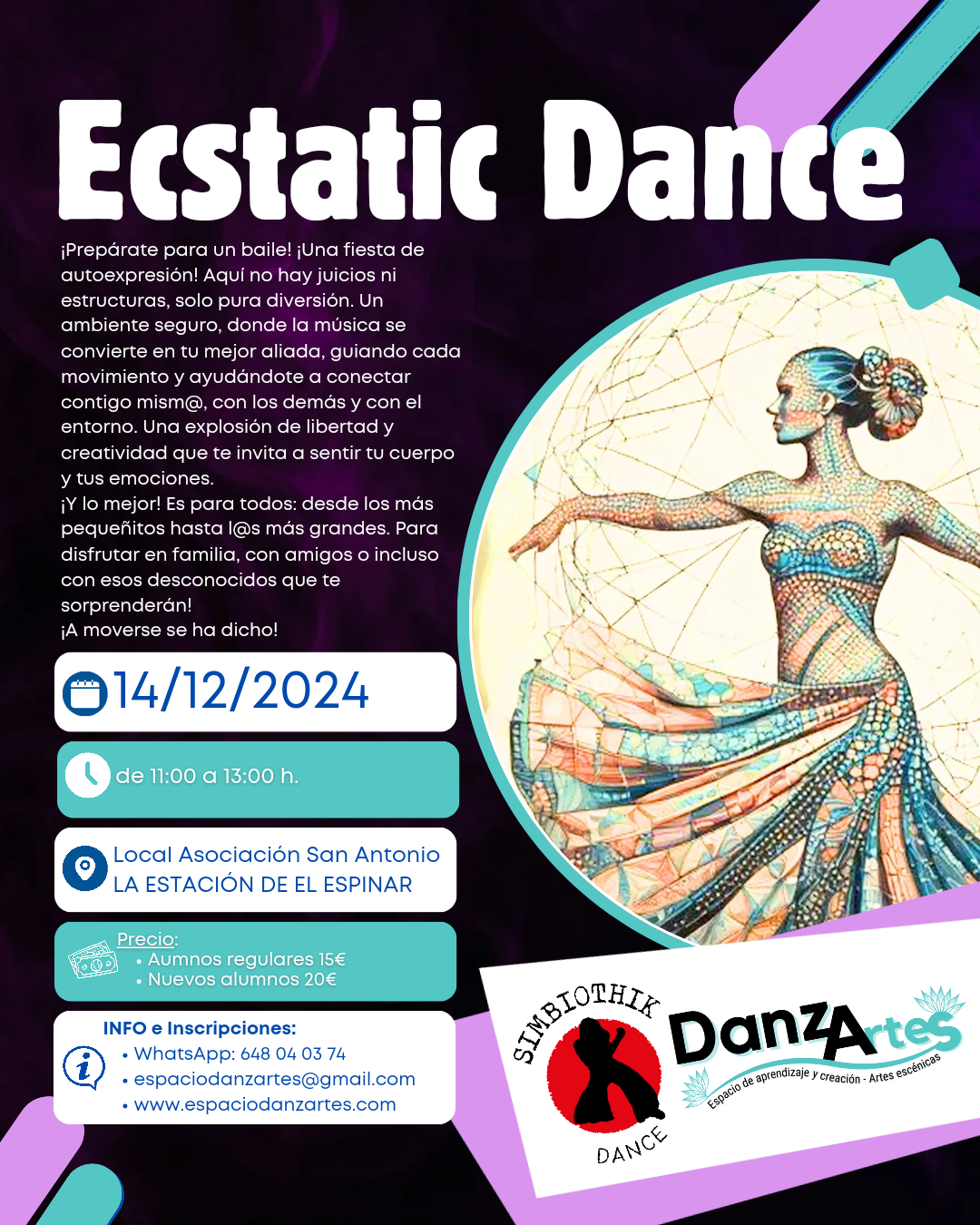 ¡Prepárate para un baile! ¡Una fiesta de autoexpresión! Aquí no hay juicios ni estructuras, solo pura diversión. Un ambiente seguro, donde la música se convierte en tu mejor aliada, guiando cada movimiento y ayudándote a conectar contigo mism@, con los demás y con el entorno. Una explosión de libertad y creatividad que te invita a sentir tu cuerpo y tus emociones.