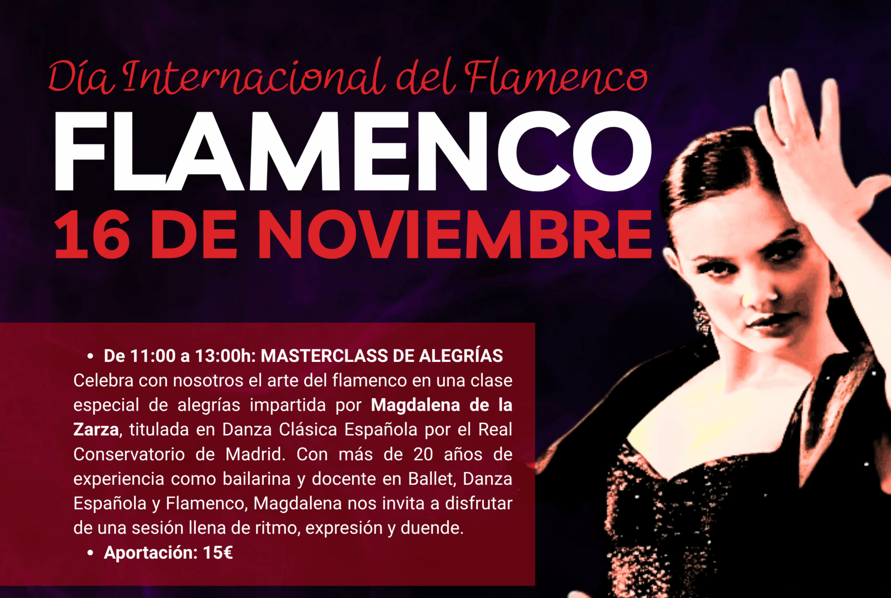 💃 16 de noviembre – Día Internacional del Flamenco 💃¡Ven a celebrar con nosotros una jornada llena de arte, compás y alegría!Disfrutaremos de una Masterclass de alegrías con Magdalena de la Zarza, bailarina y profesora titulada por el Real Conservatorio